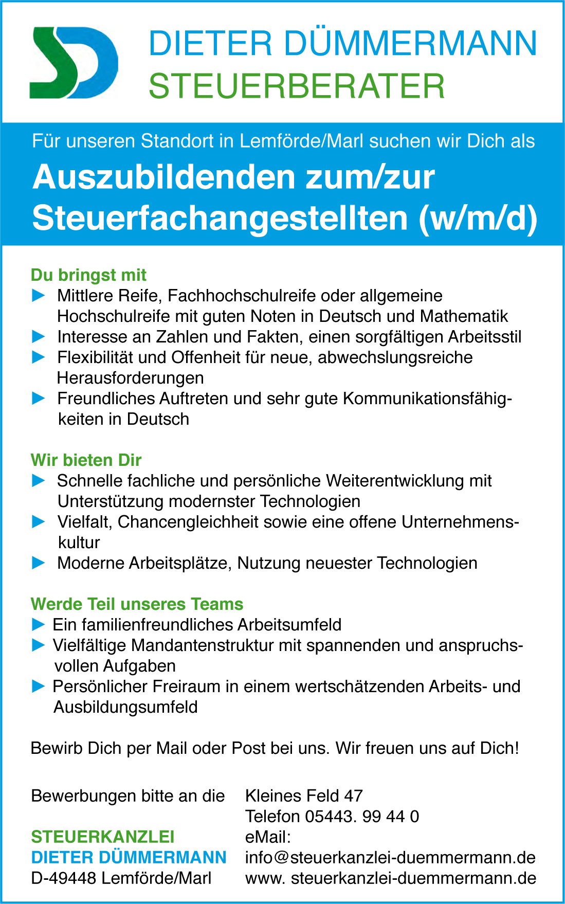 Bitte sende Deine Bewerbungsunterlagen per Post oder E-Mail an uns.